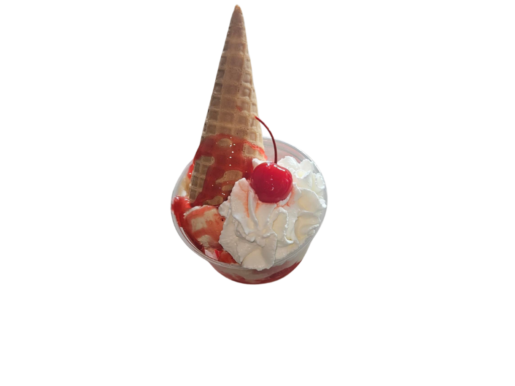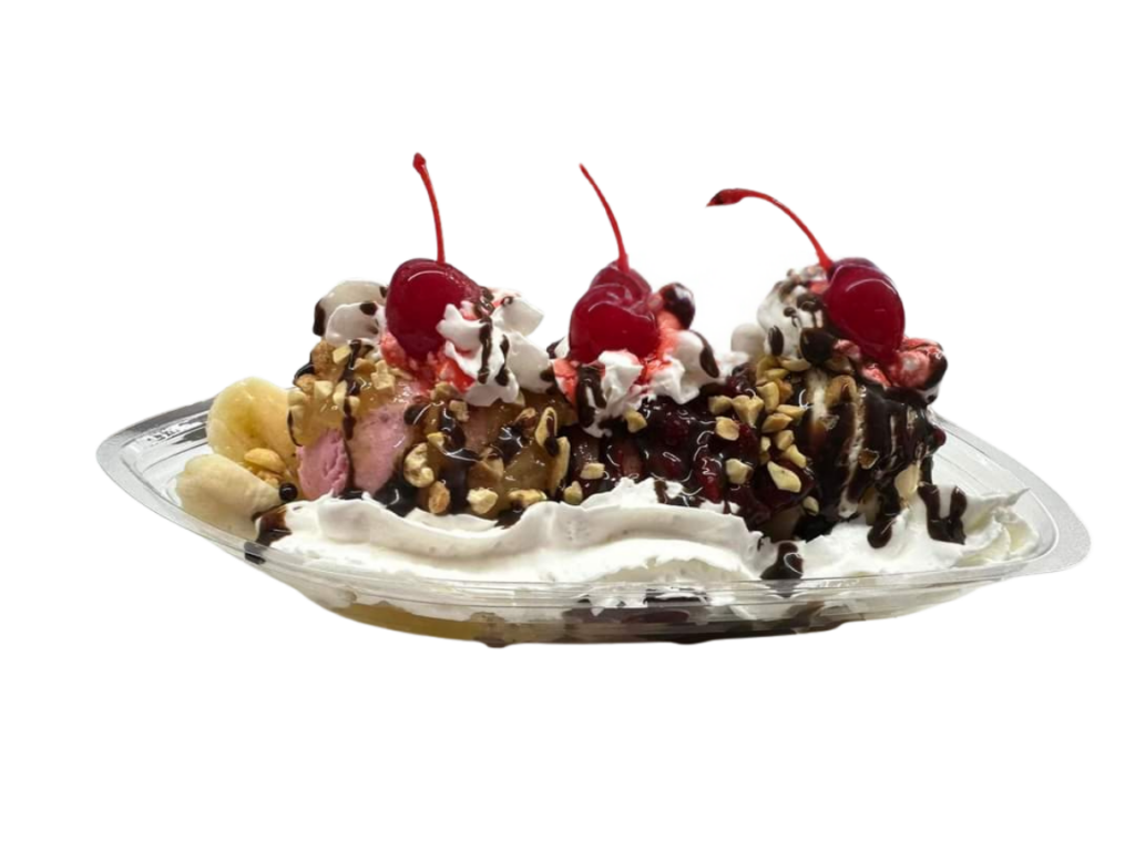 - Banana Split (3 Scoops Ice Cream, sliced banana, chocolate syrup, pineapple, strawberry, maraschino cherries topped with whip cream)